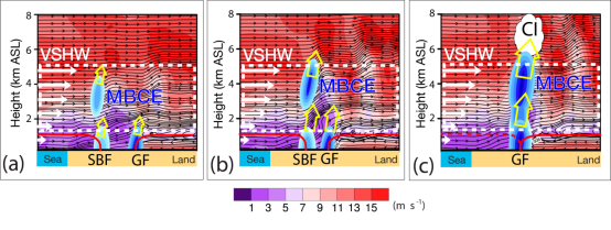 · 基于多种气象观测资料和高时空分辨率WRF数值模拟,揭示一次渤海湾地区碰撞型海风锋(MSBF)导致的对流触发(CI)机理,并首次提出MSBF在碰撞过程中出现的中层阻塞辐合效应(Mid-level Blocking Convergence Effect, MBCE)概念。本研究发现,海风锋(SBF)和阵风锋(GF)在相向移动过程中,在两者之间的弱风速区随着两条锋面的相向移动逐步被挤压升高到中层,当SBF后方中层的较高风速的气流遇到该弱风速区时形成气流阻塞,形成该中层气流的辐合抬升,从而对该高度的空气粒子带来较强的辐合抬升作用,该过程被称为“中层阻塞辐合效应”(MBCE)。该MBCE在两条锋面相向移动靠近过程中逐步增强,为低层的辐合抬升作用提供进一步“接力”抬升作用,在两条锋面碰撞过程中提供持续且较强的动力强迫。此外,在中低层出现较强的风切变(即水平风的垂直切变,VSHW)提供扭转作用,与MBCE共同为空气粒子提供动力加速度,从而导致CI(图6)。该研究有助于提高MSBF有关CI机理的认识。(Zheng and Abulikemu et al., 2022)