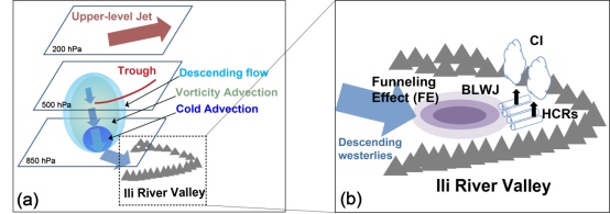 · 基于多种观测资料和高时空分辨率WRF数值模拟,结合准地转ω方程和地形敏感性实验,首次揭示了发生在新疆伊犁河谷(Ili River Valley)地区水平对流卷(HCRs)、边界层西风急流(BLWJ)、峡谷效应(FE)及其相关多尺度系统共同作用下导致的一次极端降水系统的对流触发(CI)机理。本研究发现,研究区处于200 hPa高空偏西风急流出口左侧辐散区,并且受500 hPa中亚低槽的影响,槽后负涡度平流导致研究区上空形成下沉气流。同时在低层的冷平流导致下沉运动进一步增强,从而形成较强且深厚的偏西风下沉气流,并且移动至伊犁河谷中游区域时在FE作用下得到进一步增强,形成BLWJ,并携带较充沛的水汽进入研究区,形成HCRs。该HCRs在BLWJ前沿逐步增强,在低层造成较强的辐合抬升运动,从而导致CI(图5)。该研究为进一步深入研究伊犁河谷地区灾害性强对流天气形成机理提供了一定基础。(Kong and Abulikemu et al., 2022;孔媚霓,2022,硕士学位论文)