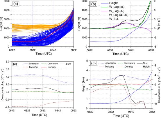 图3. (a)代表性对流单体内空气粒子轨迹高度的随时间变化,其中来自边界层(1500 m)以上和以下的粒子高度高度分别标为橙色和蓝色,代表性粒子轨迹高度标为红色;(b)代表性粒子轨迹高度(蓝色实线)及其轨迹上多种意义的垂直速度随时间变化;(c)两条锋面前方形区域面400 m及以下高度面平均的动力加速度若干个组成部分随时间变化;(d)代表性粒子轨迹上的动力加速度组成部分随时间变化。