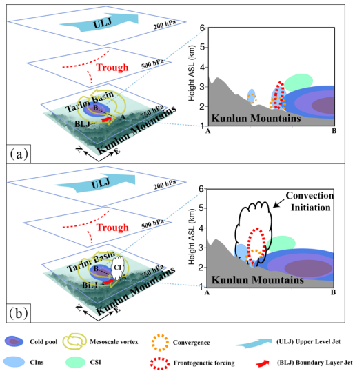 图8. 昆仑山北坡的暴雨天气过程中与中尺度气旋、边界层急流(Boundary Layer Jet,BLJ)和冷池(Cold Pool,CP)等多个系统共同作用的对流触发(CI)机理概念模型。