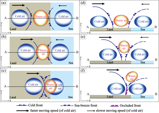 图4. 非典型锢囚过程概念模型。(a,b,c)表示海风锋与阵风锋相向移动并碰撞形成非典型锢囚过程的三个阶段平面示意图。(d-f)表示(a-c)中沿着AB线段的垂直剖面图。图中黑色箭头大小和方向表征两条锋面的移动方向和相对速度大小,(f)中紫色锋面符号表示锢囚锋。