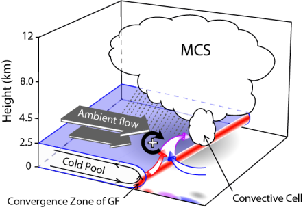 图1. 本次过程中阵风锋附近的对流触发机理概念模型(三维立体效果图)
