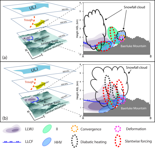 · 基于多种气象观测资料和高时空分辨率WRF数值模拟,揭示一次发生在新疆准噶尔盆地西部山区(塔城地区巴尔鲁克山)的一次暴雪过程的发生发展机理,发现低空急流和低层冷锋不仅从不稳定能量的角度为暴雪天气的发生发展过程提供了重要的贡献,而且还提供了重要的释放不稳定能量所需的锋生强迫作用(图7)。该成果为该地区暴雪天气预测预警提供了理论参考(He and Abulikemu et al., 2023)。